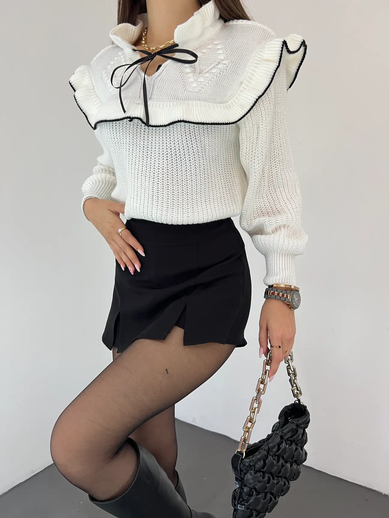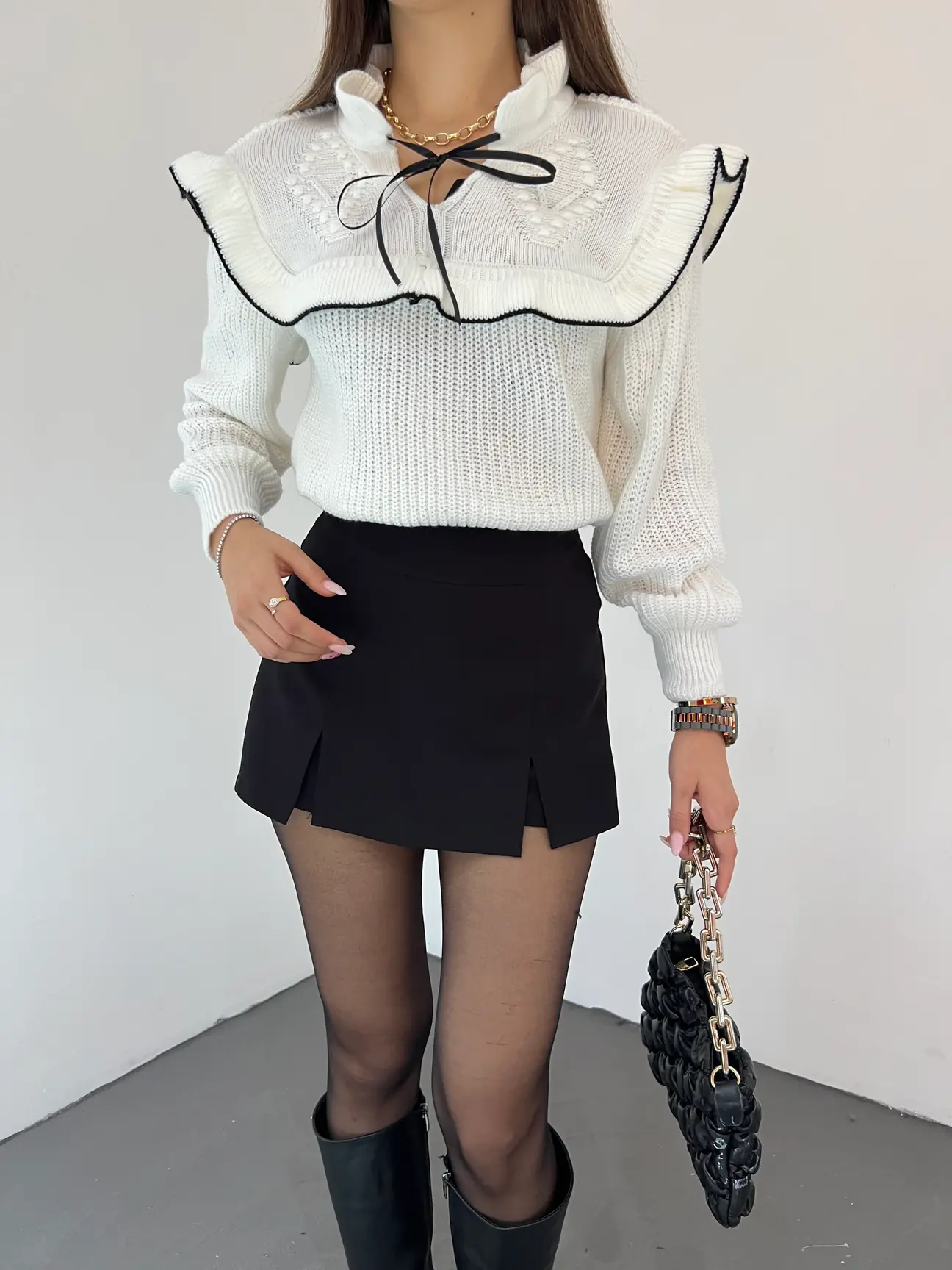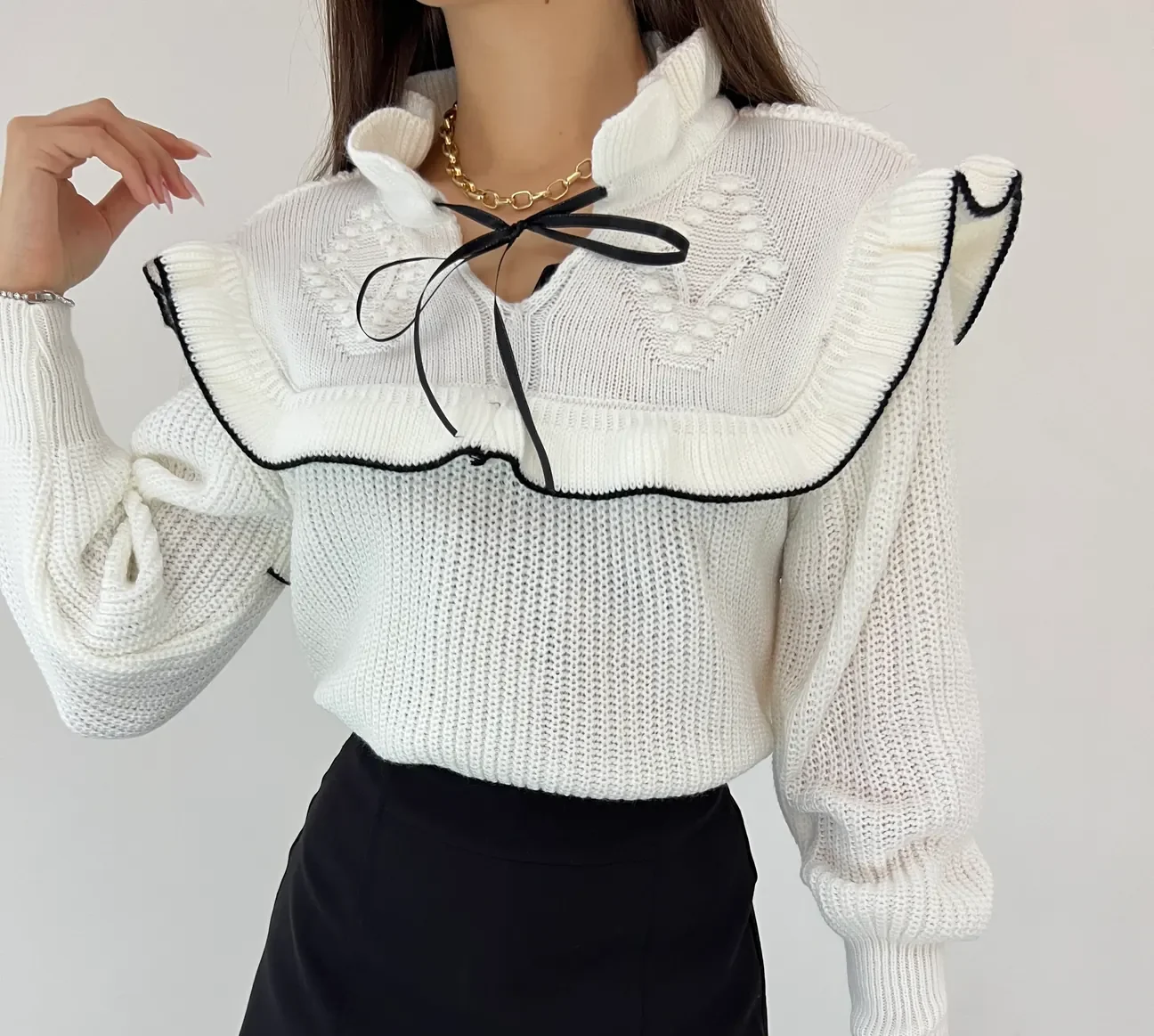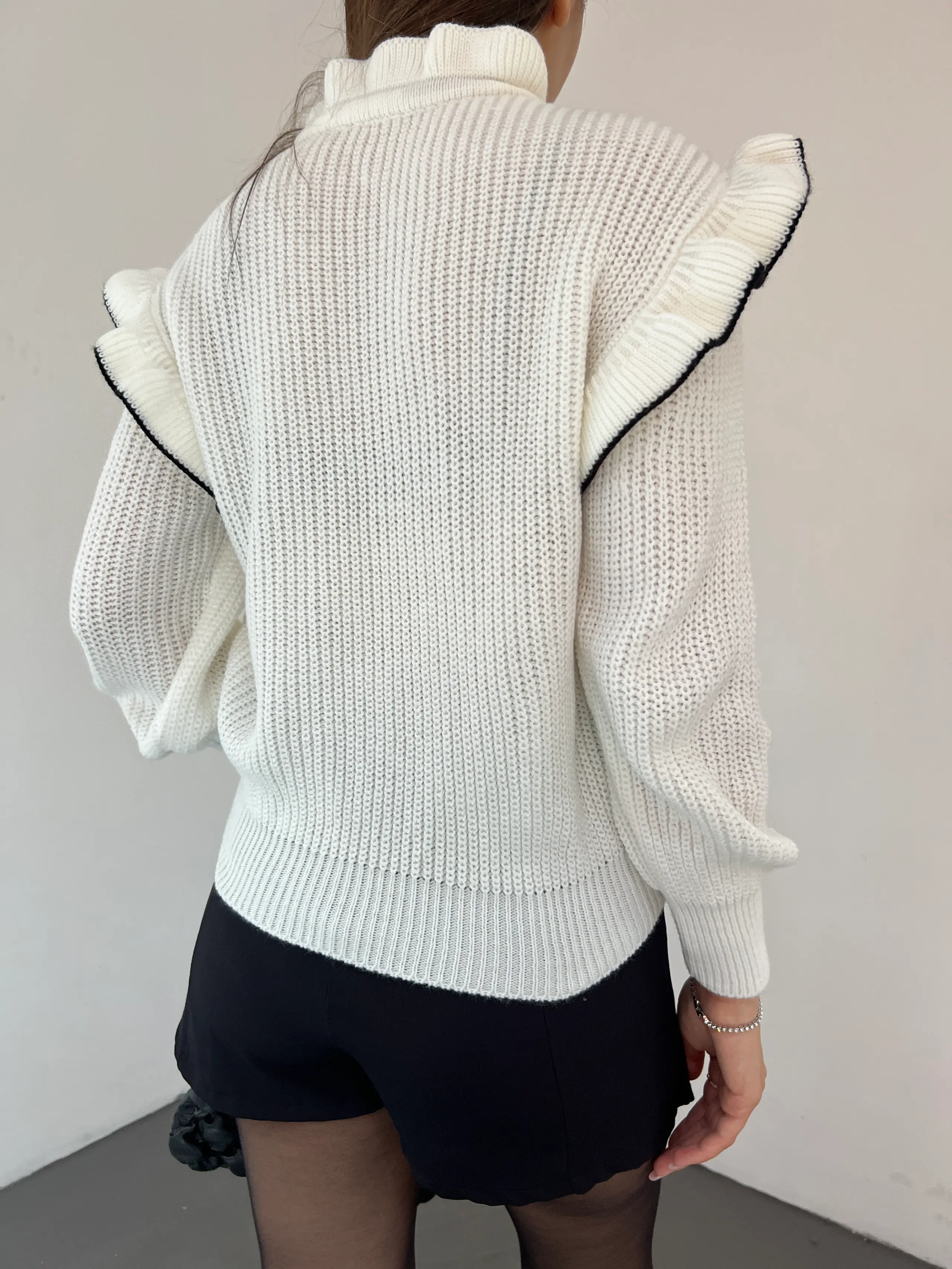 Bağcık Detaylı Valonlu Kazak – Beyaz
