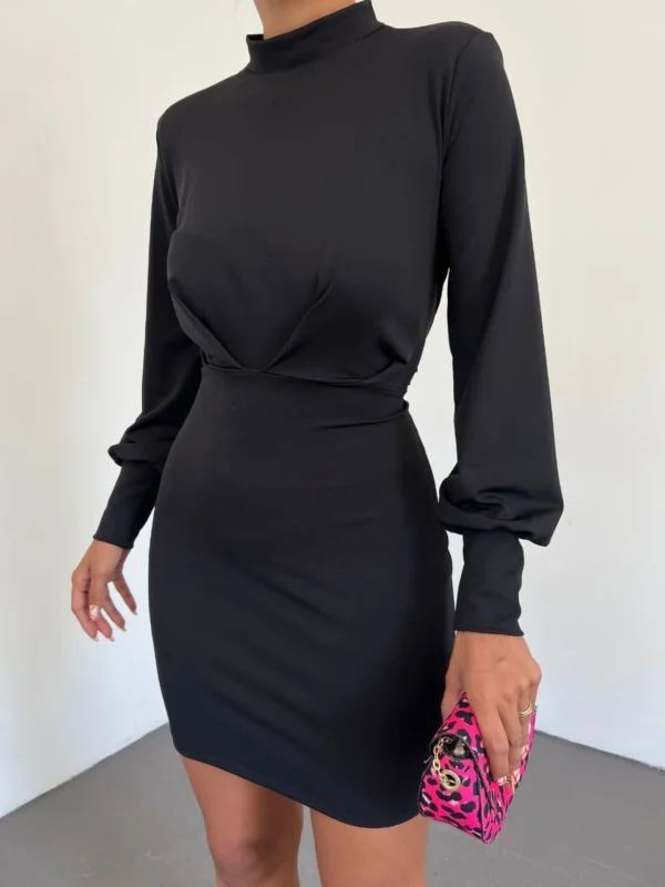 Dik Yaka Manşet Detaylı Mini Elbise – Siyah