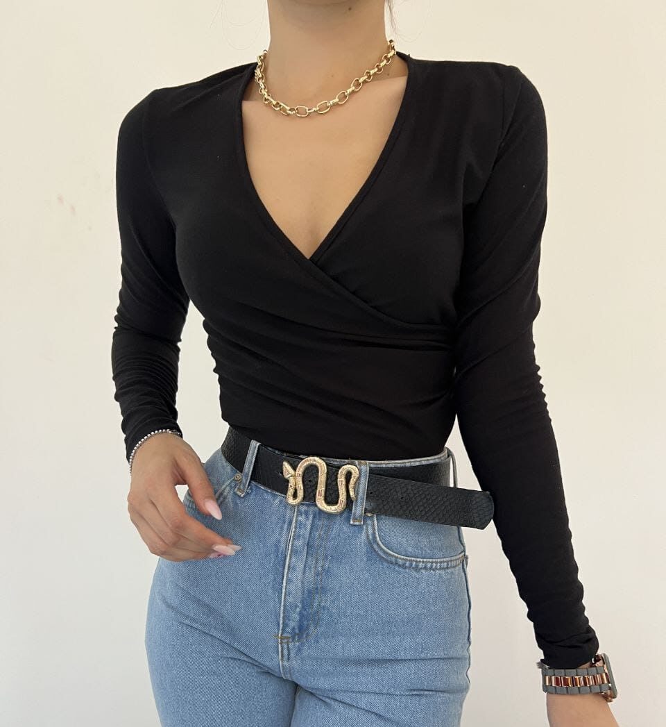 Kruvaze Yaka Bluz – Siyah